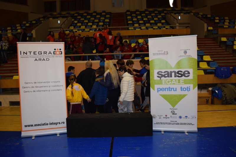 INTEGRA ASOCIAŢIA PERSOANELOR CU DIZABILITĂŢI MENTALE a organizat evenimentul ,,Şanse egale pentru toţi,, în data de 10 noiembrie 2016, orele 10-14 la Sala Polivalentă Arad. Evenimentul finanţat de către Centrul Municipal de Cultură Arad în cadrul programului ,,Tineret, Învăţământ, Recreativitate,, sesiunea de proiecte I din 2016. Scopul proiectului este dezvoltarea fizică sănătoasă şi armonioasă a copiilor şi tinerilor participanţi prin activităţi şi întreceri sportive, socializarea persoanelor cu dizabilităţi prin activităţi sportive și culturale, implicarea unor parteneri şi voluntari pentru o cât mai bună interacţionare cu persoanele aflate în dificultate, valorizarea copiilor şi tinerilor cu dizabilităţi mentale prin activităţi creative şi recreative, concursuri sportive adaptate Special Olympics (alergare, aruncarea mingii la ţintă, traseu aplicativ de gimnastică) în care fiecare sportiv a fost premiat, ateliere creative şi momente artistice. Au participat elevi din şcoli, beneficiari ai ONG, DDAC si DGASPC, părinţi şi aparţinători, voluntari, reprezentanţi ai instituţiilor.